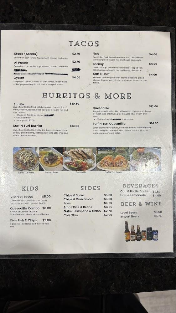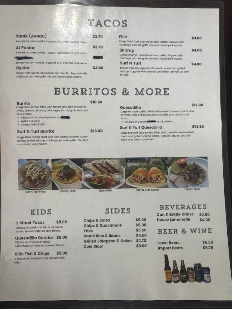 The menu at The Oyster Shuckers is a delicious mix of seafood and tacos, appealing to various palates. Highlights include the oyster tacos, which feature crisp, freshly fried oysters with vibrant toppings that balance out their flavor. Customers often rave about the shrimp and steak po-boy, built with flavors reminiscent of long beach days. Beyond tacos, the menu offers enticing combinations, including the 3 Tacos Combo and the Seafood Option-3 Taco Combo, priced reasonably around $12.16. Of course, the restaurant doesn’t stop at tacos; it also serves a delightful array of sides like chips & salsa and small fries. The seafood dishes are complemented with offerings like chowder and various appetizers, ensuring there's something for everyone. The kids' menu also caters to younger diners, featuring favorites like fish and chips. Each dish is crafted to deliver freshness and flavor, truly highlighting the seafood bounty of the region.